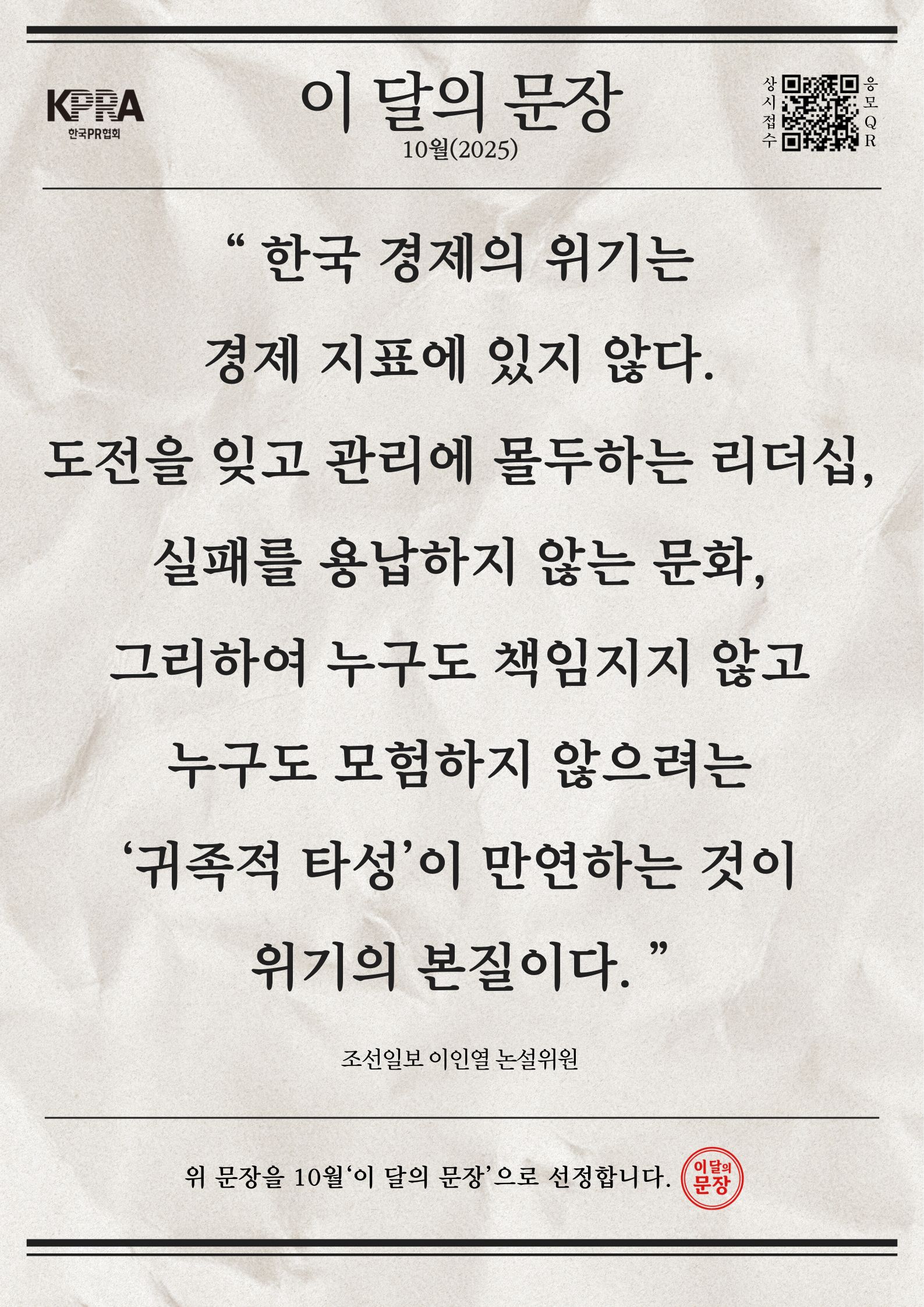 [2025.10.30(목)] 한국PR협회(회장 조영석)는 2025년 10월 ‘이 달의 문장’을 선정, 발표했다. “한국 경제의 위기는 경제 지표에 있지 않다. 도전을 잊고 관리에 몰두하는 리더십, 실패를 용납하지 않는 문화, 그리하여 누구도 책임지지 않고 누구도 모험하지 않으려는 ‘귀족적 타성’이 만연하는 것이 위기의 본질이다. 1983년 진흙탕 위에서 반도체 공장을 지으며 미래를 꿈꾸던 그 야성의 피는 어디로 증발했는가.”가 선정됐다. 이 문장은 조선일보 이인열 논설위원의 글로 2025년 10월 16일 조선일보 ‘경제포커스’에 실렸다.